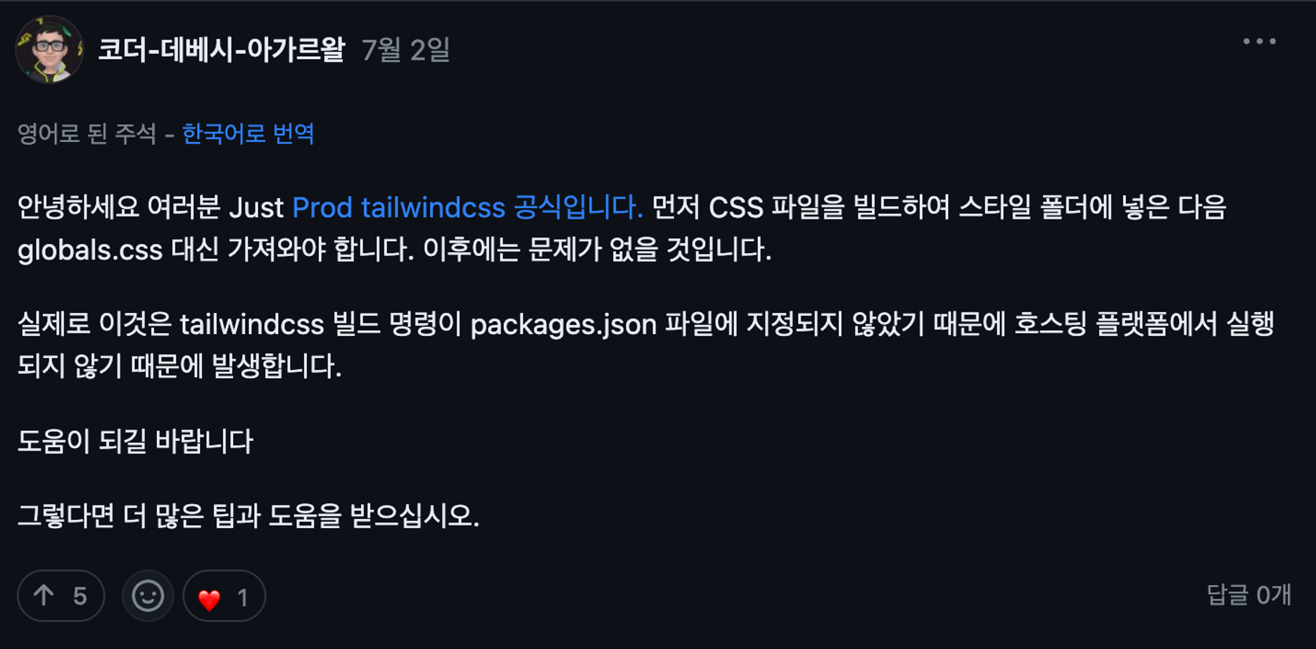 css파일을 빌드해서 그 파일을 global.css대신 불러오는 방법이었다.