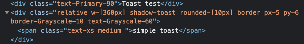 배포한 npm 패키지를 설치하고 Toast 컴포넌트를 적용시켰을 때 div에는 tailwindcss가 잘 적용된 것 처럼 나온다.