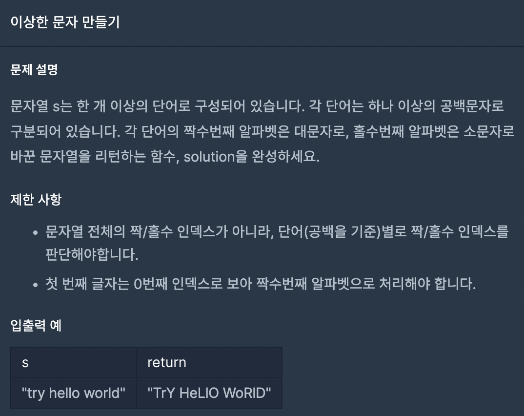 예제가 모두 소문자라 할지라도 여러가지 경우의 수가 있으며 인덱스 홀수 번째 문자가 대문자일 수도 있다. (이 생각을 못함)