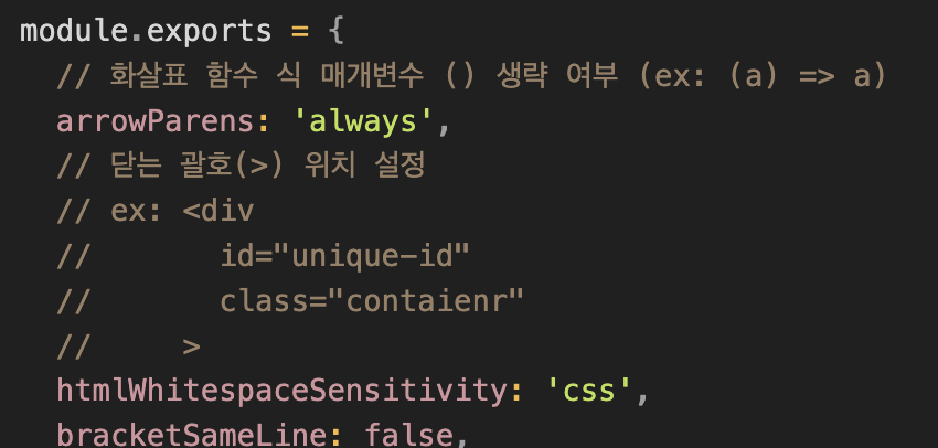 원래는 .prettierrc.js 로 파일을 만들고 그 안에 이런식으로 module.exports로 작성해줬었다.